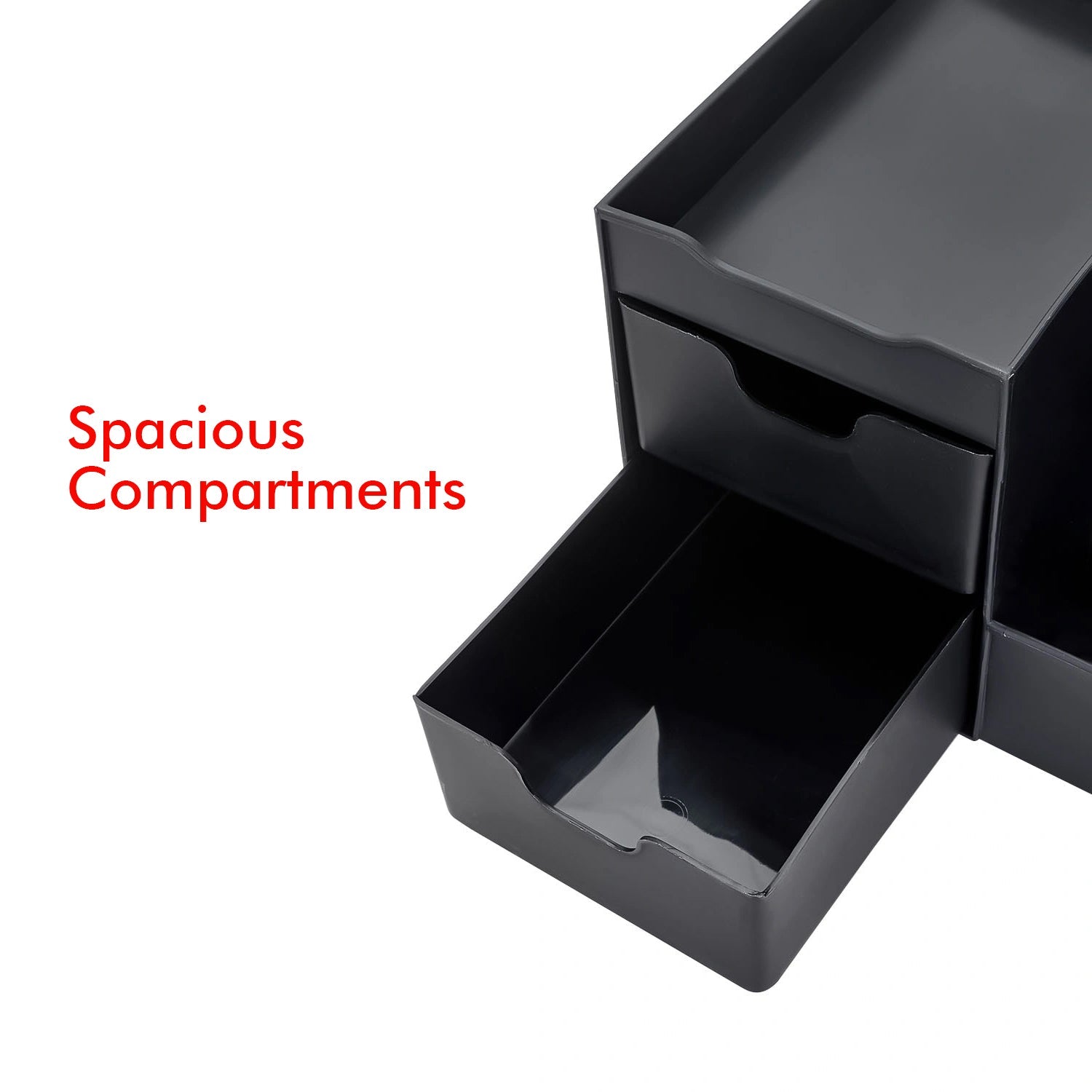 - Declutter your space with the Large Black Vanity Organizer where elegance meets everyday functionality. Designed to handle everything from beauty essentials to office supplies, this multi-purpose organizer features seven compartments and two extra-deep drawers for effortless organization.